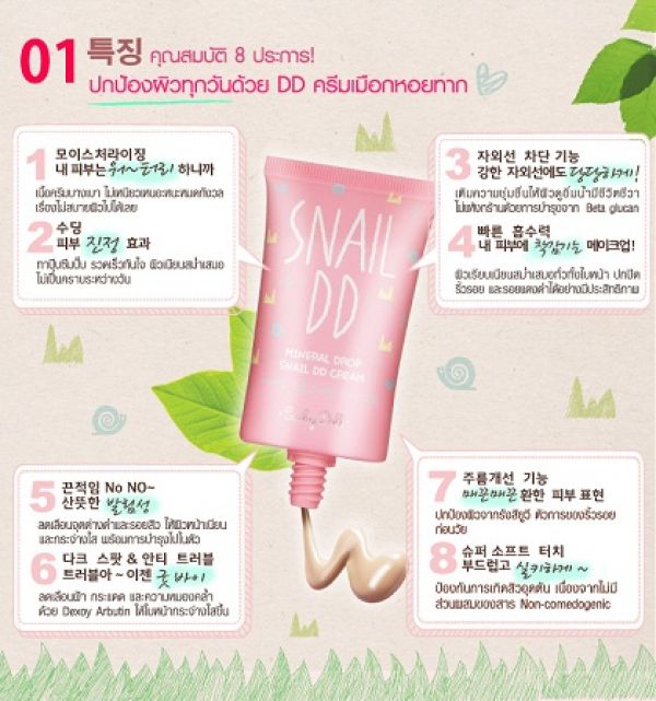 CATHY DOLL SNAIL DD Крем УЛИТОЧНЫЙ DD КРЕМ содержит увлажняющие, успокаивающие и укрепляющие кожу ингредиенты. Этот крем имеет огромные преимущества перед ВВ и СС кремами - идеальный эффект покрытия и УФ-защитой и уходом для кожи склонной к высыпаниям.