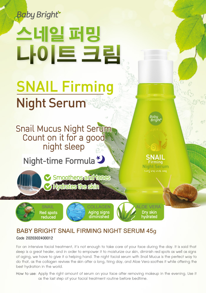 Комплексная восстанавливающая ночная сыворотка Baby Bright Snail Firming Night Serum станет достойным завершением дня для Вашей кожи.